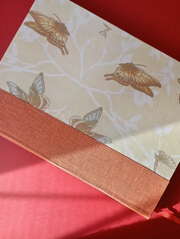 De nuestras creaciones más queridas, delicadas y con la posibilidad de espacio de guardado en el interior. Tamaño A5 (de tapa dura). 90 hojas lisas de 80gr, naturales sin ácido. Encuadernación con lomo curvo, costura francesa interna. Tapa lámina de mariposas, y cobertura papel texturado. + 2 bolsillos internos