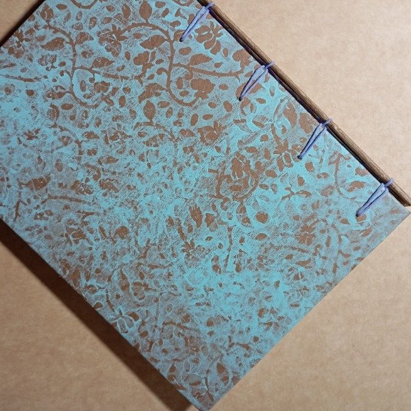 Encuadernación belga. Tapa realizada con estenciles de flores en acrílico. La primer hoja de amor está hecha con papercut. Tamaño A5, hojas lisas (papel ahuesado sin conservantes), cantidad 90 hojas.